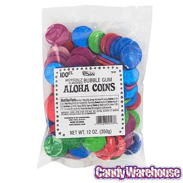 Bag contains 100 Aloha Bubble Gum Candy Coins.