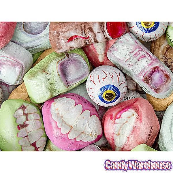 Grotesque chocolate treats from the mad scientist lab of Dr. Scab, M.D….. chocolate fingers and toes, ears, fangs, peanut butter filled lips, and fudge-filled eyeballs are sure to fright and delight!