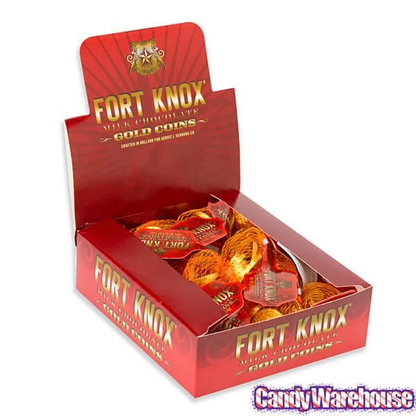 Display box contains 30 Fort Knox Gold Foiled Chocolate Coins in Mesh Bags, each with a net weight of 0.625 ounce.