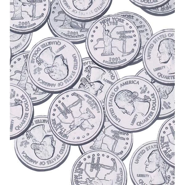 Bag contains 5 pounds of Foiled Milk Chocolate Silver State Quarters.