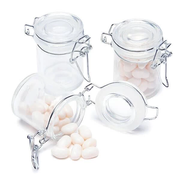 Adorable favor jars featuring metal swing top locking mechanisms and white rubber gaskets to seal in freshness. The have a nostalgic air about them, reminiscent of an old time apothecary candy counter or a pantry shelf of fruit preserves. Just waiting to be filled with your favorite sweets matching your party color scheme and decorated with your custom labels and ribbons, these unique jars make the perfect gifts at any special event!