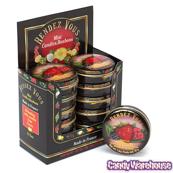 Display box contains 12 Rendez Vous Wild Berry Mini Bon Bons Candy Tins.