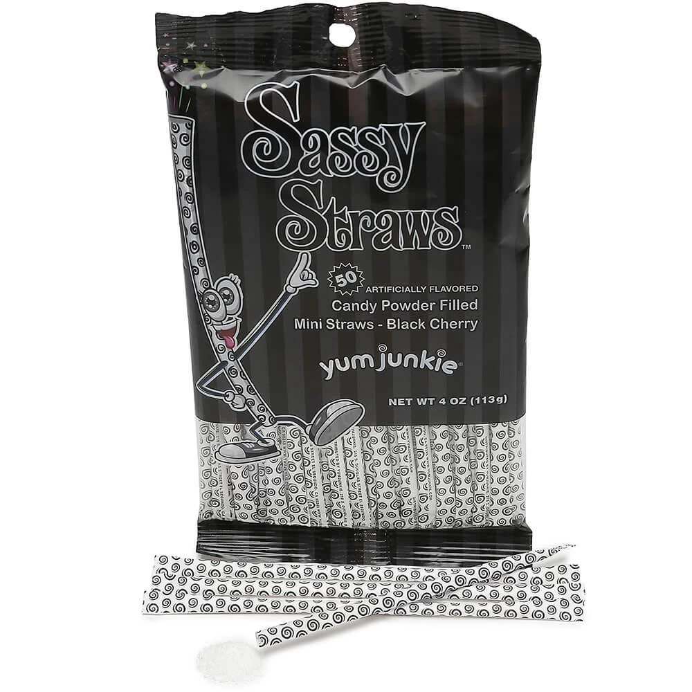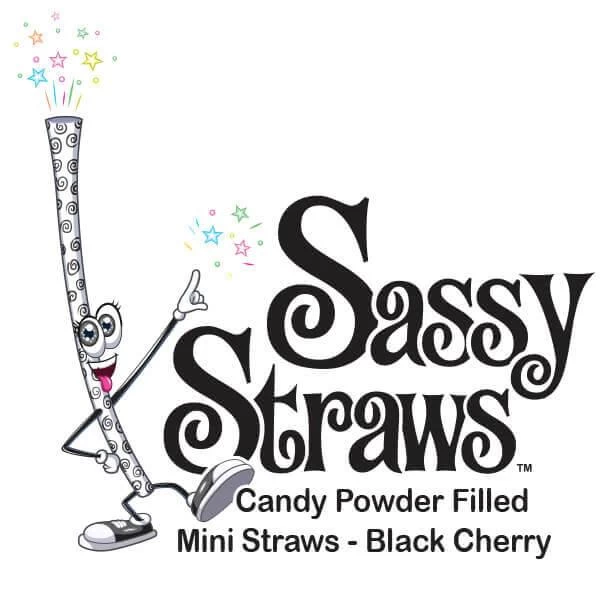 Bag contains 50 Sassy Straws Black Cherry Candy Powder Filled Mini Straws.